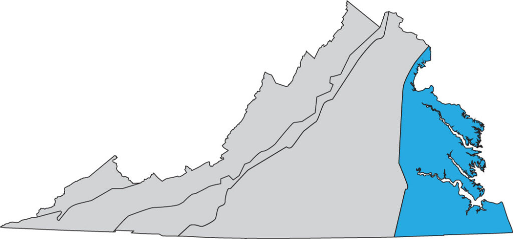 Britannica describes The Coastal Plain, as the Tidewater. It consists of a low-lying alluvial plain on the western shore of the Chesapeake Bay between the Atlantic Ocean and the Fall Line. It is crossed by the Potomac, Rappahannock, York, and James rivers and their tidal estuaries. The Great Dismal Swamp, astride the boundary with North Carolina to the south. Rich with history and natural beauty, the first English settlements in America were founded here beginning with Jamestown in 1607.